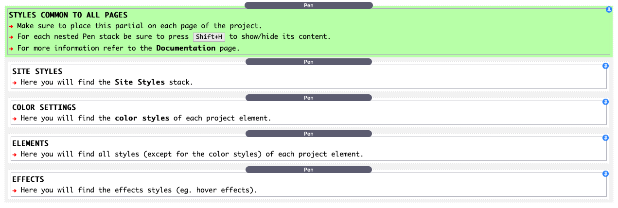 This section explains how the STYLES COMMON TO ALL PAGES partial is structured so as to understand its logic and be able to better manage all styles. When you open the partial you will find the following Pen stacks inside it which represent the main types of styles of the project:
