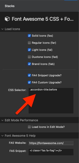 accordion-title:before class within the CSS Selector text area. In this way we set the Font Awesome font for the accordions title icons: